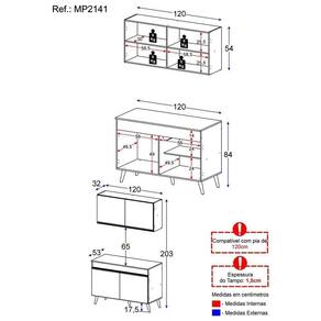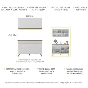 Dimensões do produto montado: Altura: 203cm | Largura: 120cm | Profundidade: 32cm (aéreos) - 53cm (balcão com tampo) *Você pode consultar as medidas internas na imagem técnica do produto.