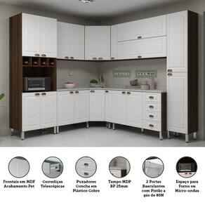 A Cozinha Safira traz design e sofisticacao, a combinacao perfeita entre beleza e funcionalidade. Desenvolvida em MDP, o que garante qualidade e durabilidade. Conta puxadores Bronze e pes com regulagem de altura no acabamento PS Cromado.
