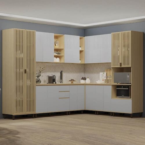 O Paneleiro de Cozinha tipo cristaleira possui duas portas ripadas de vidro e prateleiras internas, oferecendo espaço amplo e visual elegante. O Paneleiro Torre Quente duas portas superiores ripada é ideal para micro-ondas e forno elétrico, com duas prateleiras e dois nichos que facilitam a organização.