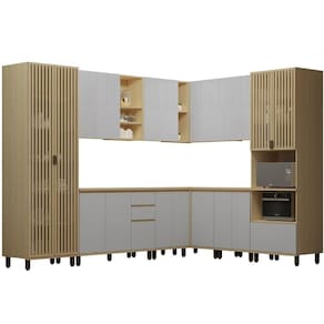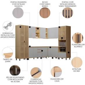 O Armário aéreo de 120cm tem duas portas, duas prateleiras internas e nichos com fundo ripado, agregando sofisticação ao ambiente. Além disso, o conjunto inclui dois Armários Aéreos de 60cm, com uma prateleira e duas portas, e um Armário Aéreo Canto Reto com duas portas e dois nichos, aproveitando bem os cantos da cozinha.