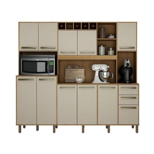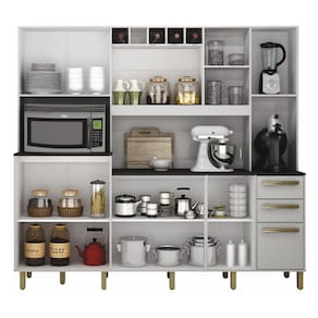 O armário de cozinha Valdemóveis Petra é o produto ideal para você tornar o seu espaço mais prático e bonito e ter a cozinha dos seus sonhos. São 11 portas disponíveis nesse kit que proporcionam uma maior repartição do produto, ideal para você organizar seus alimentos e utensílios domésticos. As duas gavetas com corrediças telescópias são firmes e deslizam suavemente, facilitando a visualização do conteúdo interno e trazendo uma maior segurança ao abrir e fechar as divisões. Os nichos com espaço para decoração e adega para vinhos foram preparados para trazer mais beleza, funcionalidade e organização a esse kit armário de cozinha, sem contar a repartição específica para micro-ondas, que facilita o uso diário do seu eletrodoméstico. A estrutura em madeira MDF/MDP de 15mm é sinônimo de durabilidade e vem acompanhada de puxadores em MDF envelopadoo que oferecem maior qualidade ao seu produto. Além disso, esse lindo kit cozinha é todo em pintura texturizada U.V com acabamento fosco e possui pés em reguláveis, o que oferece a facilidade de nivelar o seu armário na altura exata e traz aquele acabamento moderno ao seu ambiente.