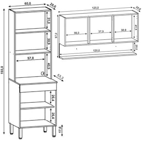 Dimensões do Produto: (L x A x P) Armário Aéreo: 120 x 67 x 28,6 cm. Paneleiro: 60 x 193 x 53,3 cm. Peso: 56,45 Kg.