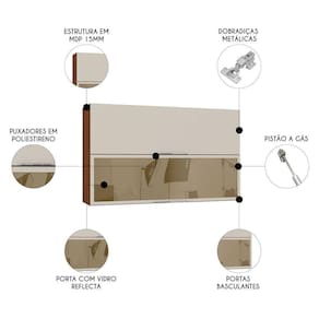 Não há nada melhor do que ter uma Cozinha bonita e funcional! Por isso, venha conhecer o Armário de Cozinha 120cm Reflecta Dora Z06 Nogueira/Off, da Mpozenato, desenvolvido especialmente para transformar o seu espaço! Fabricado em MDP de 15 mm, o Armário Aéreo dispõe de duas portas basculantes, sendo uma delas com vidro reflecta, conta com dobradiças metálicas, puxadores em poliestireno e pistão a gás que oferece suavidade no abrir e fechar, proporcionando mais conforto e evitando impactos. O acabamento em pintura fosca texturizada na estrutura e acetinada nas portas, com secagem realizada por luzes UV, confere ao móvel um toque agradável e elegante, além de aumentar sua resistência e durabilidade. Este Armário de Cozinha possui prateleira interna e é perfeito para organizar seus itens com praticidade, tornando sua rotina mais eficiente. Não perca tempo, adicione ao seu carrinho agora mesmo! Especificações Dimensões do ProdutoLargura: 120 cm. Altura: 72 cm. Profundidade: 31 cm. Peso: 25,7 Kg. Características do Produto Material da Estrutura: MDP 15mm. Material do Fundo: HDF 3mm. Peso Suportado: 24 Kg distribuídos. Acabamento: Texturizado/Pintura UV. Escala de Brilho: Fosco/Acetinado. Possui Portas: Sim. Quantidade de Portas: 2 Portas. Tipo de Porta: Basculante. Possui Pistão a Gás: Sim. Material das Dobradiças: Metálicas. Possui Puxador: Sim. Material do Puxador: Poliestireno. Possui Prateleiras: Sim. Quantidade de Prateleiras: 1 Prateleira. Possui Nicho: Não. Diferenciais: - Design moderno. - Porta com vidro reflecta. - Portas basculantes. - Pistão a gás. Sistema de Montagem: Cavilhas /Parafusos. Manual de Montagem: Sim. Complexidade da Montagem: Baixa. Volumes: 2 Volumes. Conteúdo da Embalagem: 1 Armário Aéreo. do Fabricante: 90 dias contra defeito de fabricação. Montagem: Recomendamos que seja feita por um . Recomendação de Limpeza: Utilize pano levemente úmido. Observações importantes: - Produto para uso residencial em ambiente interno, não devendo ficar exposto diretamente ao sol, calor e umidades excessivas. - Pode haver alguma diferença de tonalidade entre a imagem e o produto real, por conta do tratamento de imagens e a calibração de cores do seu monitor. - As imagens são meramente ilustrativas, não acompanham objetos de decoração e eletrônicos. - Confira o estado da embalagem, não devendo assinar o comprovante em caso de danos. - Não asseguramos, no ato da , por subir escadas/elevadores, pelo transporte por guincho em apartamentos ou montagem, desmontagem e instalações. Eventuais despesas são por conta do comprador. - Confira as dimensões do produto e certifique-se de que passará normalmente por supostos elevadores, portas, escadas e/ou corredores de sua residência.