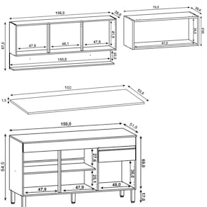 Conteúdo da Embalagem: 1 Balcão, 1 Armário Aéreo 150cm, 1 Armário Aéreo 70cm, 1 Tampo.