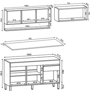 Conteúdo da Embalagem: 1 Balcão, 1 Armário Aéreo 150cm, 1 Armário Aéreo 70cm, 1 Tampo.