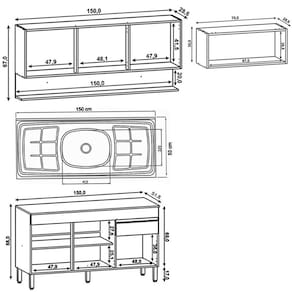 Conteúdo da Embalagem: 1 Balcão, 1 Armário Aéreo 150cm, 1 Armário Aéreo 70cm, 1 Pia Inox.