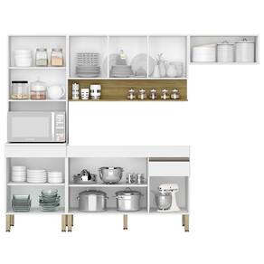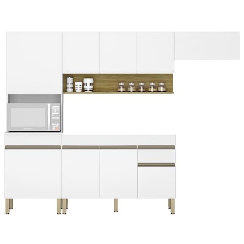 A Cozinha Modulada é composta por um armário aéreo de três portas com nicho para colocar objetos decorativos, um armário aéreo 70cm, um gabinete com 3 portas e 1 gaveta com corrediças metálicas, puxadores em alumínio e prateleira interna para manter seus utensílios de cozinha organizados e um paneleiro Torre Quente tem 2 portas, prateleiras internas e nicho para micro-ondas. Todos os móveis são feitos de MDP de alta qualidade, com acabamento em pintura UV que protege contra riscos e desgastes. Essa opção não acompanha tampo, para que você possa escolher o que mais combina com a sua Cozinha. O design é moderno e clean, com cores que ampliam o ambiente. A montagem é rápida, e você pode escolher a disposição que mais se adapta ao seu espaço.