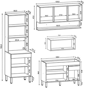 Conteúdo da Embalagem: 1 Balcão 120cm, 1 Armário Aéreo 120cm, 1 Armário Aéreo 70cm, 1 Paneleiro.