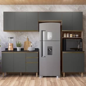 Conteúdo da Embalagem: 1 Balcão 120cm, 1 Armário Aéreo 120cm, 1 Armário Basculante, 1 Paneleiro, Tampo 120cm.