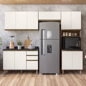 Conteúdo da Embalagem: 1 Balcão 120cm, 1 Armário Aéreo 120cm, 1 Armário Basculante, 1 Paneleiro, Tampo 120cm.