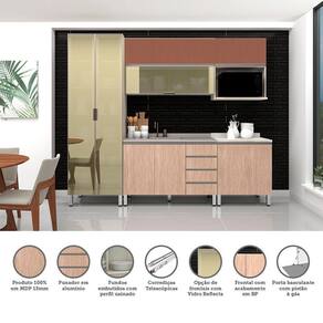 Uma cozinha modulada completa, para deixar seu ambiente super aconchegante e requintado. Composta por 6 peças cuidadosamente pensadas para sua organização. Os módulos são montados individualmente e permite a instalação da forma que melhor se adeque ao seu espaço. Contém um nicho com espaço para forno micro-ondas e vidros reflecta. Para este ambiente utilizamos como proposta de parede Linear: 260cm