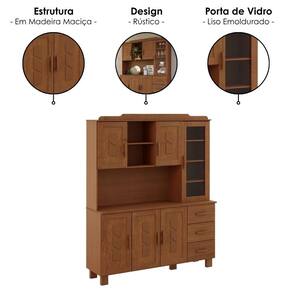 Armário de Cozinha 1240C, imponente e robusto, com ampla funcionalidade e toque rústico único que eleva o ambiente! Conta com estrutura em Madeira Maciça Taeda de 12/14/16 mm (travessa frontal 16 mm, forros 2,8 mm) e acabamento em pintura brilho 10%. Composto por portas com detalhes emoldurados, apliques sobrepostos, dobradiças metálicas e puxadores em madeira maciça (portal lateral em vidro incolor liso de 3 mm). Acompanha também prateleiras em MDF 12 mm, gavetas com corrediças telescópicas, pés retos reforçados também em Madeira Maciça (40 mm), além de tampo amplo e espaçoso, ideal para acomodar eletrodomésticos em geral. Produto será entregue em 03 volumes.