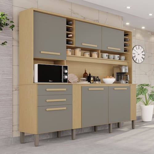 Uma dica bacana para deixar a sua cozinha ainda mais bonita, organizada e completa, do jeitinho que você sempre sonhou é o Armário de Cozinha Catar. Ele possui diversos compartimentos para guardar utensílios e mantimentos quando você for preparar aquela deliciosa refeição, nichos para garrafas, prateleiras versáteis e um lindo e moderno design. Confeccionado com materiais de qualidade, a peça conta com 6 portas e 2 Gavetas com detalhes perfeitos para as suas necessidades do dia a dia. Aproveite e adquira este lindo armário para sua cozinha! Acabamento da Prateleira: Pintura UV Escala de Brilho da Prateleira: Brilhante Acabamento da Gaveta: Pintura UV Material do Puxador da Gaveta: MDF Acabamento da Porta: Pintura Escala de Brilho da Porta: Semi-Fosco Acompanha Tampo: Sim Ambiente Principal: Cozinha Balcão Suporta Pia: Não codigo_ean: 7900288313096 Complexidade da Montagem: Média: pode ser montado por mais de uma pessoa e/ou necessite de maior conhecimento para montagem Cor: Jequitibá/Granizo Cor do Produto: Jequitibá/Granizo Escala de Brilho: Semi-Fosco Gaveta com Chave: Não Itens Inclusos: 1 Cozinha Compacta, Kit Ferragens e Manual de Montagem Linha ou Coleção: Catar Manual de Montagem e Instalação: https://product-hub-prd.madeiramadeira.com.br/710743360/documents/1b83fa54-f2dd-4e25-bb75-0d067c6e7a747d6f1712748kitcozinhacatar.pdf Marca: Sallêto Móveis Material da Corrediça: Metálica Material da Dobradiça/Corrediça da Porta: Metálica Material da Gaveta: MDP Material da Porta: MDP Material da Prateleira: MDP Material do Tampo: MDP Material dos Pés: Polipropileno Medida de cada item (A x L x P): 200x200x45 modular: Não Necessita Montagem: Sim O Balcão Acompanha Pia: Não Origem do Produto: Nacional Pés Reguláveis: Sim Peso: 97,3 kg Peso Máximo por Gaveta: 5 kg Peso Máximo por Prateleira: 3 kg Possui Pés: 08 Possui Portas: Sim Possui Prateleiras: Sim Possui recorte para Cooktop: Não Possui Rodízio: Não Produto Montado: Sim Recomendações de Uso, Manutenção e Limpeza: Para limpar corretamente seus armários de madeira, use sempre um pano liso e levemente umedecido com água. Sapatas Niveladoras: Sim Sistema de Montagem: Parafusos, Cavilhas, Dobradiças e Puxadores. Tamanho Indicado da Pia: Não possui. Tipo de Corrediça da Gaveta: Metálica Telescópica Tipo de Dobradiça da Porta: Simples Tipo de Puxador da Gaveta: Externo Tipo de Puxador da Porta: Externo Marca: Não Informado