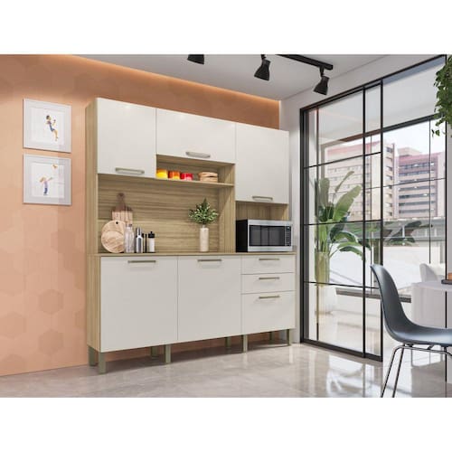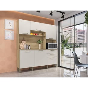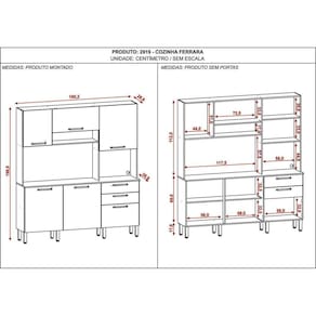 Cozinha Ferrara traz a tona todo o conceito de amplitude e organização para o ambiente, amplas repartições e nichos compõe a peças para melhor dispor de objetos e afins, contém também espaço para forno ou micro, trazendo a praticidade de ter tudo em um só produto. Além de respeitar o meio ambiente a cozinha Ferrara vem com o acabamento em pintura com secagem em luzes UV. Acabamento da Prateleira: Pintura Texturizada UV Escala de Brilho da Prateleira: Fosco Acabamento da Gaveta: Pintura Texturizada UV Escala de Brilho da Gaveta: Fosco Material do Puxador da Gaveta: Poliestireno Acabamento da Porta: Pintura Texturizada UV Escala de Brilho da Porta: Fosco Material do Puxador da Porta: Plástico Acabamento dos Pés: Polipropileno Acompanha Tampo: Não Altura dos Pés: 17 cm Altura Máxima dos Pés: 17.0000 Ambiente Principal: Cozinha codigo_ean: 7909903607206 Complexidade da Montagem: Média: pode ser montado por mais de uma pessoa e/ou necessite de maior conhecimento para montagem Cor: Freijó/Soft Cor do Produto: Freijó/Soft Cor Interna: Freijó Escala de Brilho: Fosco Espessura do Material da Estrutura: 15 mm Gaveta com Chave: Não Informações Complementares: Considerar um peso bem distribuído por todo o produto. Itens Inclusos: 1 Armário, Kit Ferragens e Manual de Montagem Linha ou Coleção: Cozinhas Compactas Manual de Montagem e Instalação: https://product-hub-prd.madeiramadeira.com.br/896227/documents/a9e30ac7-f9e3-4aa2-bc3b-153918519642110965702919cozinhaferrara.pdf Material da Dobradiça/Corrediça da Porta: Metálica Material da Gaveta: MDP Material da Porta: MDP Material da Prateleira: MDP Material dos Pés: Polipropileno modular: Não Necessita Montagem: Sim O Balcão Acompanha Pia: Não Origem do Produto: Nacional Pés Reguláveis: Sim Peso: 78,15 kg Peso Máximo por Gaveta: 10 kg Peso Máximo por Prateleira: 5 kg Possui Pés: 08 Possui Portas: Sim Possui Prateleiras: Sim Possui recorte para Cooktop: Não Possui Rodízio: Não Possui Vidro: Não Produto Montado: Sim Recomendações de Uso, Manutenção e Limpeza: Utilizar somente pano seco para a limpeza. Evitar mover o produto com utensílios dentro do mesmo. Atentar para as especificações no esquema de montagem sobre o peso suportado pelo produto. Sapatas Niveladoras: Não Sistema de Montagem: Parafusos, Cavilhas, Pregos. Suporta Até (kg): 114 kg Tamanho Indicado da Pia: Não Possui Balcão Tamanho Indicado do Tampo: Não Possui Balcão Tipo de Corrediça da Gaveta: Metálica Telescópica Tipo de Dobradiça da Porta: Simples Tipo de Puxador da Gaveta: Externo Tipo de Puxador da Porta: Externo