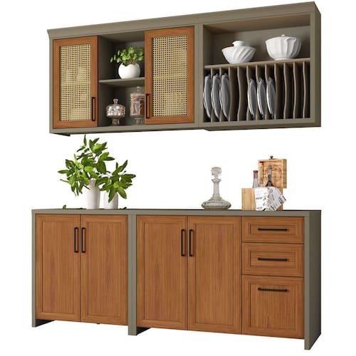O Armário de Cozinha 6 Portas Camponesa - Nesher irá proporcionar praticidade e elegância ao seu ambiente. Possui dois armários aéreos, um deles com detalhe de rattan em suas portas, promovendo sofisticação ao seu espaço e amplo espaço de armazenamento, já o outro com nicho e porta prato. Também conta com dois balcões, com um tampo amplo e um ótimo espaço interno para guardar seus utensílios.