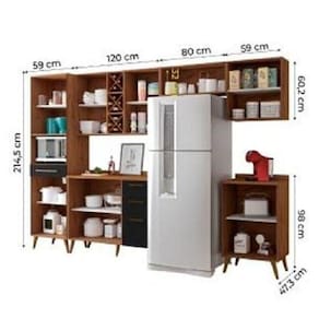 ITENS INCLS: 1 Armário Aéreo duplo; 1 Armário Aéreo; 1 Balcão 1,20m; 1 balcão 0,59m; 1 Paneleiro p/ micro-ondas e 1 Armário de geladeira.