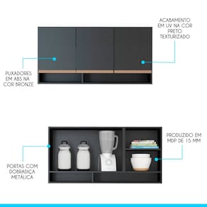 O Armário Aéreo para Cozinha Sabrina foi desenvolvido para atender todas as suas necessidades do dia a dia com um design moderno, cheio de atitude, personalidade, funcionalidade, beleza e versatilidade. A cozinha preta é uma tendência e foi arquitetada para facilitar a sua rotina diária mantendo seu ambiente organizado e aconchegante. Possui três portas com prateleira interna e nicho. A elegância fica por conta dos puxadores em perfil e os pés na cor bronze dando um toque único de sofisticação. A Cozinha Sabrina é produzida com materiais de excelente qualidade, garantindo a durabilidade e vida útil. O melhor em móveis no design atual aliando conforto, qualidade e ótimos preços, só na Menu Móveis! \n \n- Produzida em 100% MDP de 15 mm\n- Puxadores Perfil PVC na cor Bronze\n- Portas com Dobradiça Metálica\n- Pintura UV na cor Preto Texturizado\n \nInformações Técnicas:\nAltura: 60 cm\nLargura: 120 cm\nProfundidade: 31,5 cm\nPeso: 24,5 kg\n \nInformações Adicionais:\n*ATENÇÃO: Não trabalhamos e não nos responsabilizamos pela montagem do móvel. Antes da montagem conferir se o produto está de acordo com o que comprou, produto montado e danificado pela montagem não será aceito troca. Montagem e instalação por conta do comprador.\n**As imagens ambientadas são meramente ilustrativas e podem apresentar itens que não compõe o produto. As cores do produto podem variar de acordo com o monitor, a iluminação do ambiente ou sua percepção visual. \n***Limpeza: Deve ser feita com pano macio e seco ou levemente umedecido com água e sabão neutro. Não devem ser utilizados abrasivos como palha de aço e objetos cortantes.\nGarantia para defeitos de fabricação conforme Código de Defesa do Consumidor. Ean: 7805295001175 Ean: 7805295001175