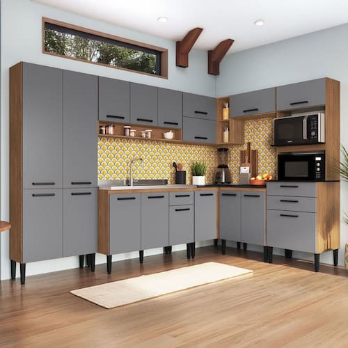 O(a) Armário de Cozinha Amanda 18 Portas 3 Gaveta Freijó/Cinza - Pnr Móveis é produzido em MDP na escala de brilho Fosco, e possui um grau de dificuldade de montagem: Médio.