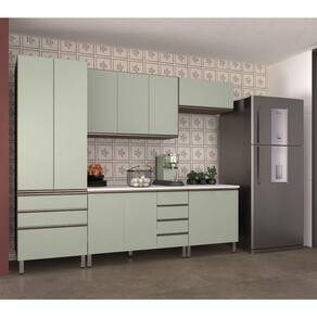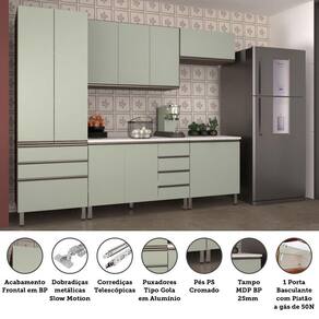 Desenvolvida com materiais de altíssima qualidade, a Cozinha Jade oferece excelente distribuição de espaço interno, dobradiças Slowmotion com amortecedor incorporado para fechamento suave das portas. Puxadores tipo Gola em perfil alumínio na cor Inox com ponteira de proteção. Pés PS cromado com regulagem de altura.