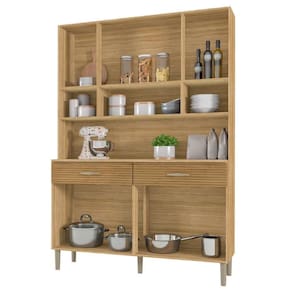 Produzido em MDP de 12mm e 15 mm, com oito portas - sendo duas portas superiores com vidro, dobradiças e corrediças 100% metálicas, duas amplas gavetas, puxadores ergonômicos em plástico resistente (poliestireno), pés fixo em plástico resistente (polipropileno).