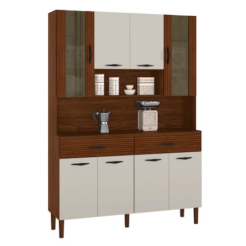 Produzido em MDP de 12mm e 15 mm, com oito portas - sendo duas portas superiores com vidro, dobradiças e corrediças 100% metálicas, duas amplas gavetas, puxadores ergonômicos em plástico resistente (poliestireno), pés fixo em plástico resistente (polipropileno).