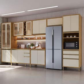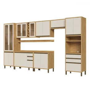 O(a) Armário de Cozinha com Balcão e Tampo 17 Portas 5 Gavetas Pérola 100% Mdf Vidro Reflecta Amêndoa/Off White - Pnr Móveis é produzido em 100% MDF na escala de brilho Semi-Brilho, e possui um grau de dificuldade de montagem: Médio.