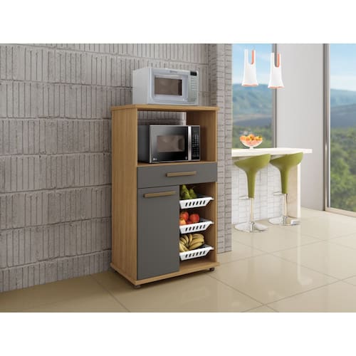 Unindo praticidade e funcionalidade a Fruteira Fortaleza era o que faltava em sua cozinha. Seu balcão com 2 tampos resistente é perfeito para micro-ondas ou forno elétrico. Possui também um a gaveta ampla com corrediça telescópica, uma prateleira interna removível e fruteiras em plastico.  \nEspecificações Produto Montado: Altura: 127 cm Largura: 73 cm Profundidade: 45 cm Quantidade de Volumes: 1 Peso:38kg\nGarantia: 3 Meses Número de Portas: 01 Número de Prateleiras: 01 Número de Gavetas: 01 Número de Cestos: 03 Possui vidro: Não Possui rodízio: Sim\nObservações: Não oferecemos serviço de montagem, mas todos os produtos possuem manual de montagem com o passo a passo. Recomendamos contratar um profissional de montagem. Pode existir alguma diferença de tonalidade entre a foto e o produto, devido ao tratamento de imagens e à calibração de cores do monitor