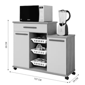 Armários são indispensáveis e essenciais na cozinha, proporcionam praticidade e versatilidade para o dia a dia, que de fato é o que os consumidores procuram. Ter à mão tudo o que você precisa de uma maneira simples e rápida é muito importante. A Fruteira Teresina vai trazer mais organização e harmonia a sua cozinha. Ela conta com 3 cestos removíveis, 2 portas, 1 gaveta, e rodízios para auxilia-lo\nEspecificações do Produto Montado Altura: 88 cm Largura: 107 cm Profundidade: 39 cm Peso: 37Kg Quantidade de Volume: 1\nGarantia: 3 Meses Número de Portas: 02 Número de Prateleiras: 01 Número de Gavetas: 01 Número de Cestos: 03 Possui vidro: Não Possui rodízio: Sim \nObservações: Não oferecemos serviço de montagem, mas todos os produtos possuem manual de montagem com o passo a passo. Recomendamos contratar um profissional de montagem. Pode existir alguma diferença de tonalidade entre a foto e o produto, devido ao tratamento de imagens e à calibração de cores do monitor