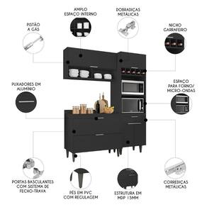 O Paneleiro conta com dois compartimentos para acomodar micro-ondas e forno elétrico, e cinco nichos na parte superior. Ele também inclui três portas, sendo uma delas basculante, além de uma gaveta. O Armário Aéreo vem com uma porta basculante com pistão a gás e dois nichos, para auxiliar na organização dos seus utensílios de forma prática e eficiente. Já o Balcão Gabinete dispõe de duas portas basculantes com fecho trava de , que permite o fechamento com um simples toque. Todos os móveis possuem estrutura em MDP 15mm, com acabamento em BP, puxadores em alumínio, dobradiças e corrediças metálicas, que garantem máxima resistência no uso diário. O tampo serve como apoio para eletrodomésticos ou no preparo dos alimentos, e o rodatampo que é um excelente acabamento entre o balcão e a parede. Os pés em PVC, são reguláveis, permitindo ajustar pequenos desníveis de piso. Este Armário de Cozinha é a solução ideal para otimizar sua casa, combinando materiais de alta qualidade com um design sofisticado.