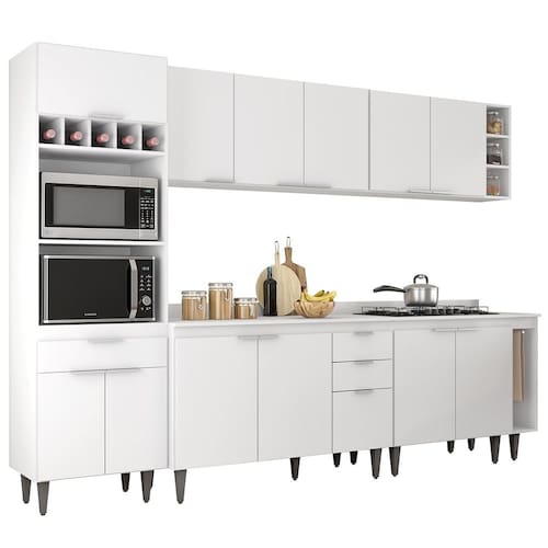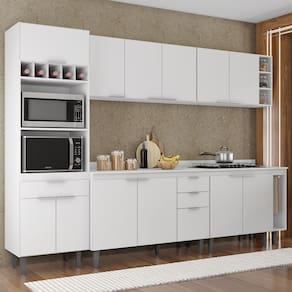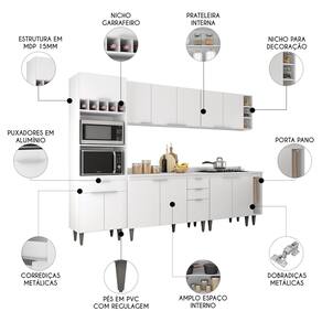 O Paneleiro conta com dois compartimentos para acomodar micro-ondas e forno elétrico, e cinco nichos na parte superior. Ele também inclui três portas, sendo uma delas basculante, além de uma gaveta para melhor organização dos seus utensílios. Os Armários Aéreos dispõe de cinco portas e duas prateleiras internas, oferecendo praticidade e estilo. O Balcão Gabinete e o Balcão 80cm possuem cinco portas e duas gavetas, com duas prateleiras internas que proporcionam amplo espaço de armazenamento. Já o Balcão Porta Pano traz um suporte de aço para guardanapos e o nicho adega que conta com três repartições. Todos os móveis possuem estrutura em MDP 15mm, com acabamento em BP, puxadores em alumínio, dobradiças e corrediças metálicas, que garantem máxima resistência no uso diário. O tampo serve como apoio para eletrodomésticos ou no preparo dos alimentos, e o rodatampo que é um excelente acabamento entre o balcão e a parede. Os pés em PVC, são reguláveis, permitindo ajustar pequenos desníveis de piso. Este Armário de Cozinha é a solução ideal para otimizar sua casa, combinando materiais de alta qualidade com um design sofisticado.