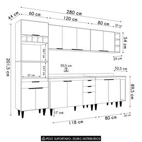 Conteúdo da Embalagem: 1 Armário Aéreo 120cm, 1 Armário Aéreo 80cm, 1 Balcão 120cm, 1 Balcão 80cm, 1 Balcão Porta Pano, 1 Paneleiro, 1 Nicho Adega, 1 Tampo.