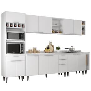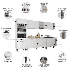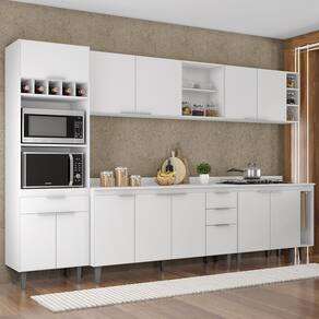 O Paneleiro conta com dois compartimentos para acomodar micro-ondas e forno elétrico, e cinco nichos na parte superior. Ele também inclui três portas, sendo uma delas basculante, além de uma gaveta para melhor organização dos seus utensílios. Os Armários Aéreos dispõe de quatro portas, dois nichos laterais e duas prateleiras internas, agregando praticidade e estilo. O Balcão Gabinete e o Balcão 80cm possuem seis portas e duas gavetas, com duas prateleiras internas que oferecem amplo espaço de armazenamento. Já o Balcão Porta Pano traz um suporte de aço para guardanapos e o nicho adega que conta com três repartições. Todos os móveis possuem estrutura em MDP 15mm, com acabamento em BP, puxadores em alumínio, dobradiças e corrediças metálicas, que garantem máxima resistência no uso diário. O tampo serve como apoio para eletrodomésticos ou no preparo dos alimentos, e o rodatampo que é um excelente acabamento entre o balcão e a parede. Os pés em PVC, são reguláveis, permitindo ajustar pequenos desníveis de piso. Este Armário de Cozinha é a solução ideal para otimizar sua casa, combinando materiais de alta qualidade com um design sofisticado.