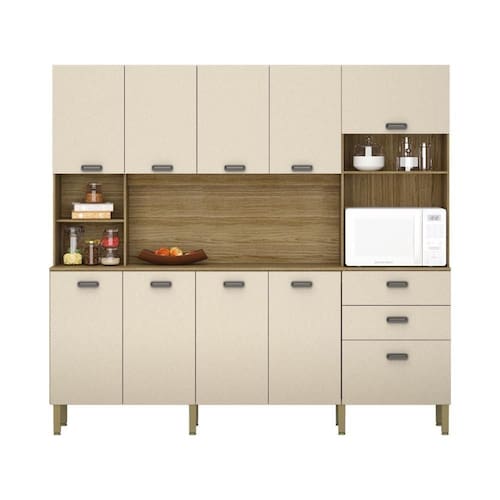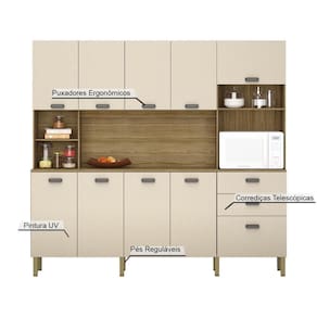 Material: MDP | Cor: Freijó/Vanilla | Cômodo Indicado: Cozinha | Dimensões do Produto (A X L X P): 204 x 222 x 46,8 | Possui Prateleira: Sim | Possui Gaveta: Sim | Tipo da Corrediça da Gaveta: Telescópicas | Possui portas: Sim | Quantidade de portas: 10 Portas | Tipo de Porta: Bater | Possui porta Basculante: Não | Possui Pistão á Gás: Não | Possui Nichos: Sim | Possui pés: Sim | Possui Vidro: Não | Quantidade de Vidros: 0 | Peso do Produto (Kg): 100.55 | Altura do Produto (cm): 204 | Largura do Produto (cm): 222 | Comnto do Produto (cm): 46.8 | Nome do Simples no Fornecedor: Intense | Garantia do Fabricante: 90 dias | Instruções/Cuidados: Evite contato com líquidos. Nada de lavar os móveis. Móveis não gostam de umidade. Não deixe o móvel exposto ao sol. Os acessórios também precisam de limpeza. | Produto precisa de Montagem?: Sim, a montagem é simples mas sugerimos a contratação de algum experiente de sua preferência | Material para Filtro: MDP | Material da Estrutura: MDP | Necessita Fixação na Parede: Não | Conteúdo Embalagem: Cozinha Compacta Ferrara | Origem: Nacional | Estado de Origem: Paraná | Quantidade de Volumes: 3 | Peso Bruto (volume 01): 42,5 KG | Comnto x Largura x Altura (volume 01): 166 x 47 x 11 | Peso Bruto (volume 02): 37,2 KG | Comnto x Largura x Altura (volume 02): 166 x 74 x 5 | Peso Bruto (volume 03): 24,4 KG | Comnto x Largura x Altura (volume 03): 116 x 75 x 5