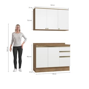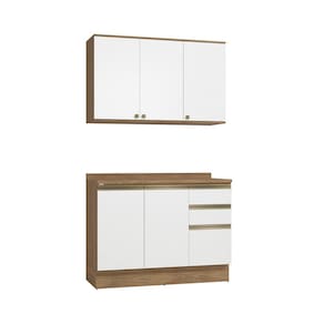 Uma combinação clássica e linda, perfeita para todos os ambientes e para quem não abre mão de sofisticação. Unindo o conforto do amadeirado e a luminosidade do branco brilho, você terá um ambiente confortável e aconchegante para preparar receitas e receber sua família e amigos. Compacto e funcional, o combo de balcão e áereo de pia é indispensável em todas as composições. Acompanhado do tampo, o balcão ainda pode ser montado com cuba ou pedra, e com duas portas, prateleiras e três gavetas, além de amplo espaço para organizar louças e mantimentos.