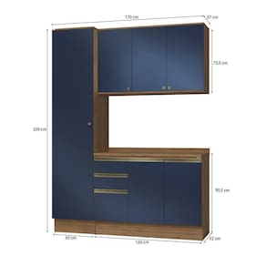Transforme sua cozinha com toda a beleza e praticidade do Conjunto CB1389 da Cozinha Celeste Kappesberg. Produzido 100% em MDF de 15mm, o que garante mais robustez, firmeza e qualidade, além de um acabamento perfeito. São 230cm de altura, 1,70m de largura e 52cm de profundidade no balcão e 37cm nos aéreos. A caixaria, em pintura touch na cor nogueira, conta com a textura dos veios da madeira, enquanto as frentes são na cor azul profundo, com acabamento fosco.
