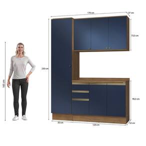 Acabamento: Pintura Fosco / Pintura Touch | Cor: Nogueira/Azul Profundo | Corrediças: Telescópicas | Dobradiça: Com Amortecimento | Garantia: 3 meses para defeito de fabricação | Matéria-prima: MDF / MDP | Peso suportado por cada gaveta: 6 Kg | Peso suportado por cada prateleira: 7 kg | Puxadores: Metálicos / Puxadores de Metal e de Alumínio | Quantidade de gavetas: 3 | Quantidade de portas: 3 | Quantidade de prateleiras: 1 / 2 / 5 | Sistema de montagem: Parafuso Philips | Tipo de porta: Bater | Duração da garantia: 3 meses | Montagem: Necessita montagem | Tipo de garantia: Garantia do fabricante | Tipo de móveis de cozinha: Combo de móveis de cozinha | Requer montagem: Sim