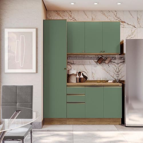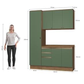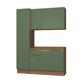 Acabamento: Pintura Fosco / Pintura Touch | Cor: Nogueira/Verde Oliva | Corrediças: Telescópicas | Dobradiça: Com Amortecimento | Garantia: 3 meses para defeito de fabricação | Matéria-prima: MDF / MDP | Peso suportado por cada gaveta: 6 Kg | Peso suportado por cada prateleira: 7 kg | Puxadores: Metálicos / Puxadores de Metal e de Alumínio | Quantidade de gavetas: 3 | Quantidade de portas: 1 / 3 | Quantidade de prateleiras: 1 / 2 / 5 | Sistema de montagem: Parafuso Philips | Tipo de porta: Bater | Montagem: Necessita montagem | Tipo de garantia: Garantia do fabricante | Duração da garantia: 3 meses | Tipo de móveis de cozinha: Combo de móveis de cozinha | Requer montagem: Sim