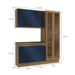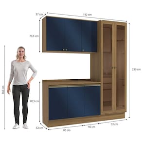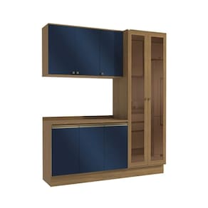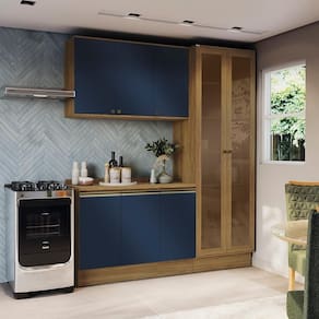 Acabamento: Pintura Fosco / Pintura Touch | Cor: Nogueira/Azul Profundo | Corrediças: Telescópicas | Dobradiça: Com Amortecimento | Garantia: 3 meses para defeito de fabricação | Matéria-prima: MDF / MDF/ Vidro / MDP | Peso suportado por cada gaveta: 6 Kg | Peso suportado por cada prateleira: 7 kg | Puxadores: Alumínio / Metálicos | Quantidade de gavetas: 1 | Quantidade de portas: 1 / 2 / 3 | Quantidade de prateleiras: 1 / 2 / 5 | Sistema de montagem: Parafuso Philips | Tipo de porta: Bater | Tipo de garantia: Garantia do fabricante | Montagem: Necessita montagem | Duração da garantia: 3 meses | Tipo de móveis de cozinha: Combo de móveis de cozinha | Requer montagem: Sim