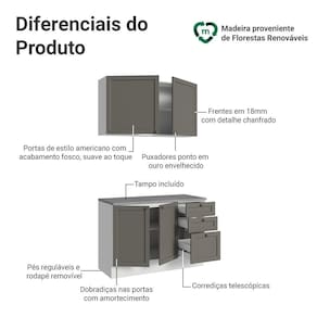O acabamento de alta resistência da estrutura é em Branco, das frentes em Cinza e possui uma textura suave ao toque. O destaque fica por conta dos puxadores ponto em ouro envelhecido, feitos com metal resistente, trazem personalidade e um charme único. Outro diferencial está no detalhe chanfrado das frentes, que forma molduras elegantes e dá profundidade ao design.