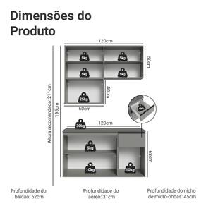 - 52 cm de profundidade no balcão, 31 cm no aéreo e 45 cm no nicho de micro-ondas