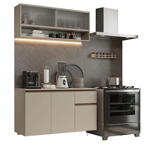 Se você busca uma cozinha com design moderno e funcional, essa composição vai conquistar você. Ela é composta por dois módulos essenciais para o dia a dia: um balcão e um armário aéreo com portas de correr em vidro pontilhado um dos grandes destaques do conjunto. O vidro confere um toque sofisticado com leve transparência, valorizando o ambiente.