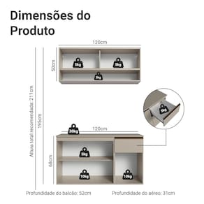 - 52 cm de profundidade no balcão e 31 cm no aéreo