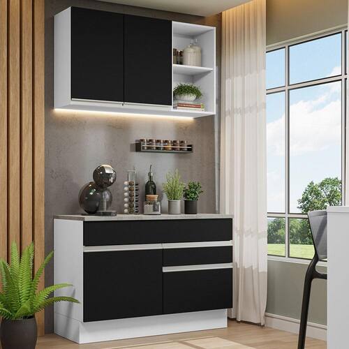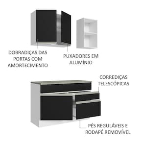 O acabamento da estrutura é branco e o das portas e frentes é preto. É feito em Pintura Poliéster ecológica, com aplicação de 7 camadas de proteção resistentes a álcool, água e calor.