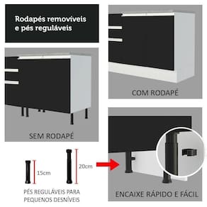 Outro diferencial é a fabricação com materiais de qualidade, como as corrediças telescópicas, os puxadores com perfil total em alumínio e as dobradiças com amortecimento para fechamento suave das portas. Além disso, os pés são reguláveis em PVC e o rodapé removível em MDP.