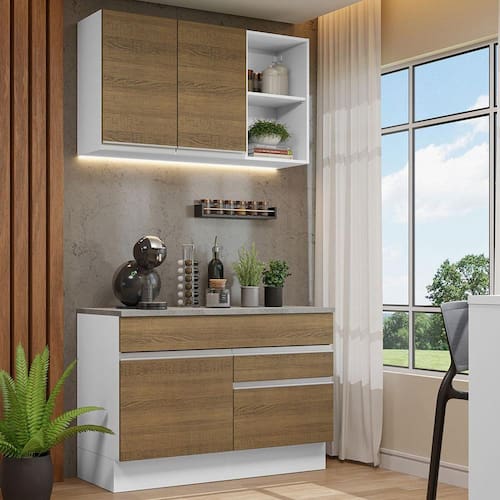 O acabamento da estrutura é branco e o das portas e frentes é em amadeirado Rustic. É feito em Pintura Poliéster ecológica, com aplicação de 7 camadas de proteção resistentes a álcool, água e calor.