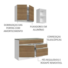 Outro diferencial é a fabricação com materiais de qualidade, como as corrediças telescópicas, os puxadores com perfil total em alumínio e as dobradiças com amortecimento para fechamento suave das portas. Além disso, os pés são reguláveis em PVC e o rodapé removível em MDP.