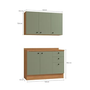 Já as frentes, na cor verde frevo, contam com acabamento fosco em BP, proporcionando maior durablidade contra riscos, arranhões e gotas d'água. Uma combinação aconchegante e moderna, remetendo aos tons da natureza e deixando seu ambiente lindo, incluindo facilidade durante a limpeza. Perfeito para ambientes compactos, o conjunto conta com 120cm de largura e 2,20m de altura, sendo compacto e funcional, une o balcão e áereo de pia, indispensáveis em todas as composições.