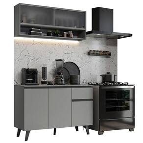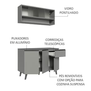 O acabamento da cozinha é cinza, feito em Pintura Poliéster ecológica, que oferece proteção contra os efeitos da água e do calor.
