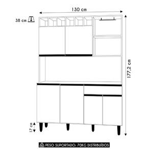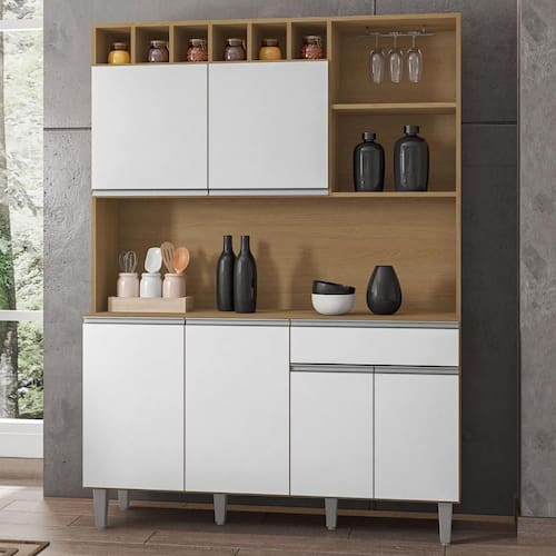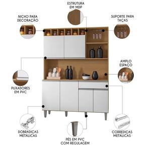 A funcionalidade desse Armário de Cozinha é outro ponto de destaque. Conta com seis portas convencionais, com dobradiças metálicas, para armazenamento de utensílios, panelas e outros itens essenciais. Além disso, possui uma gaveta ideal para guardar utensílios menores. A prateleira e os nichos são perfeitos para organizar objetos decorativos ou utensílios de uso diário, mantendo a cozinha sempre organizada e ao alcance das mãos.