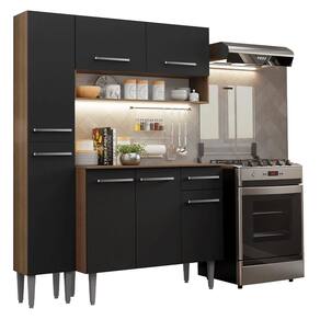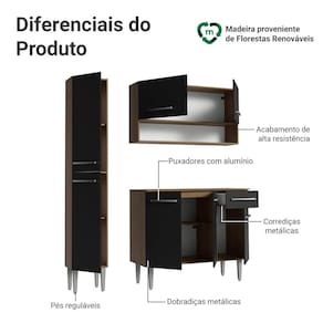 Esta composição inclui um paneleiro com duas portas, um balcão com três portas e uma gaveta, um aéreo com duas portas e um nicho aberto, oferecendo amplos espaços para armazenamento e organização. O acabamento em tom amadeirado Rustic e Preto cria um visual moderno para a sua cozinha.